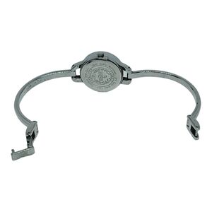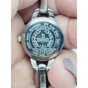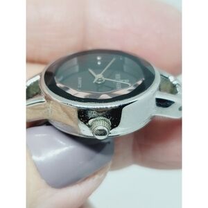 Beveled edge glass over black background with silver hands and second hand. Quartz movement.