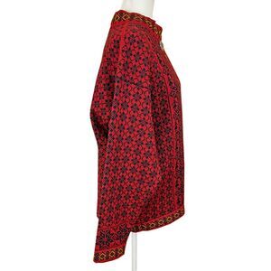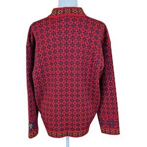 Vintage Dale of Norway Wool Cardigan Size XL Red Black Silver-tone Clasp Nordic. Sweater is in good vintage condition. There are a few interior pulls, and one repair at the neckline. These are not really visible on the exterior. (Please see last photo to see repair.) There is very minor pilling for a vintage wool cardigan. Tight-knit, heavyweight pure new wool. Deep red and black, with gold accents in design around front opening, collar, cuffs, and hemline. Silver-tone clasp at neckline. High collar. Dale of Norway patch on left sleeve above cuff. Drop shoulders.