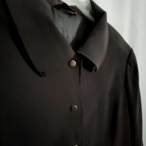 Snap closure in the front. Long sleeves with two snaps for closure on each. Collared. Lined. There are built-in shoulder pads.