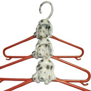 Adorable vintage Dalmatian clothes hanger set. Includes three plastic hangers with black, white, and red colors, featuring cute Dalmatian tails for hanging clothes. Perfect for adding a playful touch to any closet.