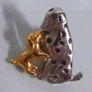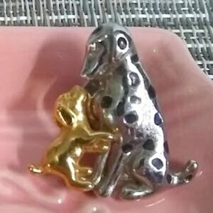 This Vintage Dalmation with Pup Lapel Pin is a cute and charming way to accessorize your outfit. This lapel pin is made of silver-tone and gold-tone metal and features a Dalmation and a puppy in a playful pose. The Dalmation is silver-tone and has black spots, while the puppy is gold-tone. The lapel pin is approximately 1 inch long and 1 inch wide from tail to tail at the bottom, and it has a spring-loaded catch back that makes it easy to attach and remove. This lapel pin is perfect for any dog lover, especially if you have a Dalmation or a mixed breed pup. It is also a great way to add some whimsy and fun to your look, whether it’s casual or formal. It is also a wonderful gift for anyone who loves animals, vintage jewelry, or both.
