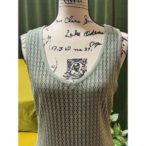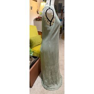 Step into understated elegance with this vintage Damainou two-piece evening ensemble. Crafted in the USA from a shimmering sage-green metallic knit, this set features a stunning sleeveless maxi dress paired with a matching open front jacket. The open-weave pattern drapes beautifully along the figure, while the intricately scalloped crochet lace panels elevate the entire silhouette