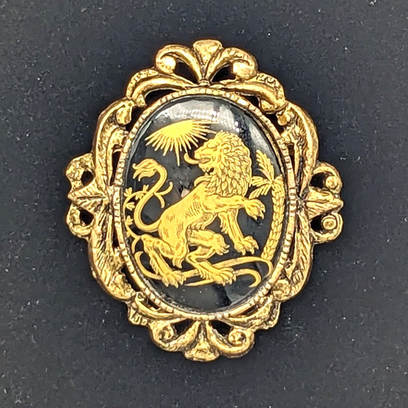 Vintage Damascene Brooch Gold Tone Framed with Heraldry Lion or Leo 1970s