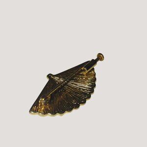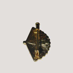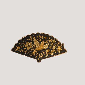Vintage Damascene Brooch Small Gold Tone Black Enamel Fan Bird Floral Design