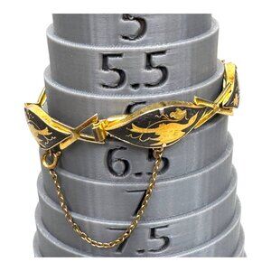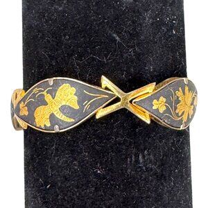 A testament to artisanal craftsmanship, this vintage damascene bracelet transforms metalwork into wearable poetry. Each curved segment tells a story of intricate goldwork dancing against a deep, oxidized background, with delicate floral motifs emerging like whispers of botanical elegance. The piece's subtle complexity invites closer examination, revealing layers of metalworking skill that transcend mere accessory status.