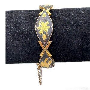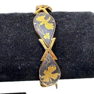 Vintage Damascene Floral Bracelet Gold Tone Inlay Elegant Metalwork Birds Spain