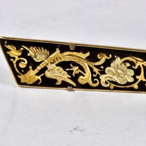 This is a Retro Damascene Spanish style tie clip in black and gold tone. It is etched in beautiful gold tone with black background. The measurements are 2 1/2 x 3/4.