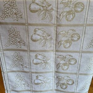 Elegant vintage damask tablecloth features luxuriously woven golden pears, grapes and cherries on a linen or ecru colored background. The gold satin weave has a lustrous matte sheen that catches the light. This stunning tablecloth is in beautiful condition and was created in Pakistan in the 1980’s. No obvious stains, no holes or tears. It’s the same quality of a Williams Sonoma, but is not tagged. The perfect muted background for your Thanksgiving or Christmas table!