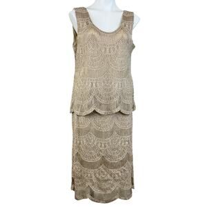 Stunning champagne knit with gold metallic threads thoughout. Tank and skirt are lined