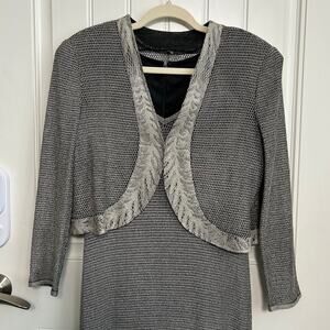 style tags: mother of bride outfit, formal occasion wear, metallic knit fabric, two piece set, evening elegance, wedding guest attire, special event dressing, art deco inspired, vintage formal wear, silver shimmer, midi maxi length, bolero jacket styling, coordinated separates, timeless sophistication, vintage evening dress