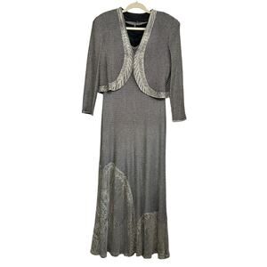 Vintage Damianou Metallic Crochet Maxi Dress Jacket Set L Mother Bride Silver