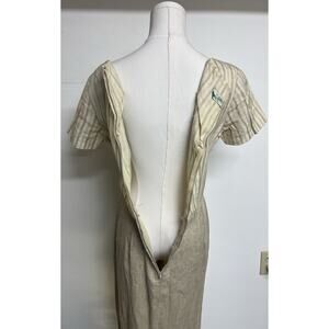 The Vintage Dan Keller Tan Wiggle Dress with short sleeves and stripes is a stylish and nostalgic piece perfect for those who love the 50s and 60s fashion. Made in the United States by the Dan Keller brand, this midi-length dress features a classic zip closure and is designed in a pencil dress style. The beige color and striped pattern add a timeless touch to the summer and spring seasons, making it a versatile option for any vintage-loving wardrobe.
