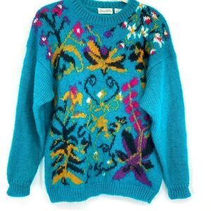 Vintage Dana Ashley Women’s Wool Mahair Embroidered Floral Sweater Turquoise L