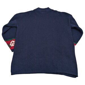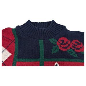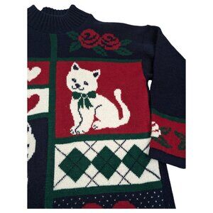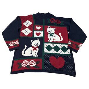 Vintage Dana Scott Cat Sweater Hearts Flowers Argyle Navy Blue Red Holiday L