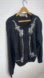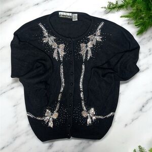 Vintage, 90s • Dana Scott Lambswool Angora Blend Sequined Beaded Button Down Cardigan Bow Sweater — cardigan had shoulder pads