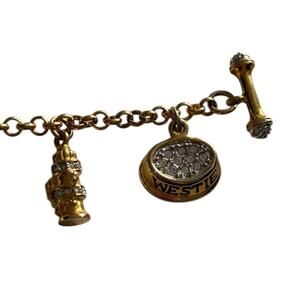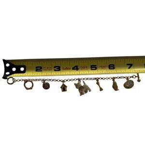 This vintage Danbury Mint bracelet is a charming addition to any jewelry collection. The goldtone charms feature a adorable Westie dog design, with sparkling rhinestones adding a touch of glamour. The bracelet has a toggle closure, ensuring a secure fit at a length of 7 inches. Perfect for any lover of vintage charm jewelry, this piece is sure to be a treasured addition to your wardrobe.
