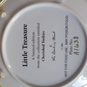 This vintage Danbury Mint, Little Treasure is a limited edition from the collection entitled Cherished Yorkies. The little face of the yorkie is just irresistible and who wouldn't want to hang it on their wall. The plate is preowned and in excellent condition. It is approximately 8 inches in diameter. The plate is made of fine porcelain and is rimmed in 22K gold. The metal frame is included with the purchase of a plate.