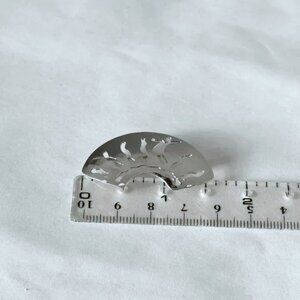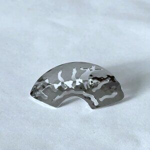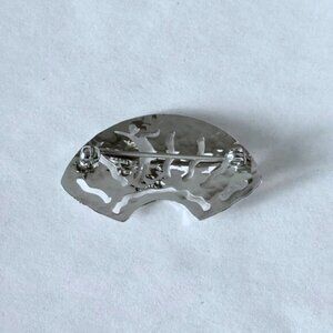 This vintage brooch pin features a series of 7 cut-out shapes including a dancing girl (number 5) in a silver tone highly reflective finish. The fan-shaped design adds a unique and elegant touch to the piece. The focus is on the intricate detailing and craftsmanship of the brooch. Perfect for adding a touch of whimsical charm to any outfit, this brooch is a timeless accessory that can be worn for a variety of occasions.