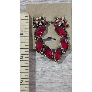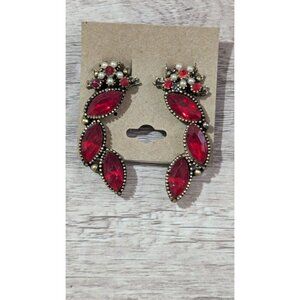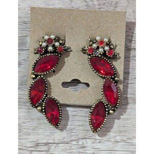 Vintage Dangle Clip-On Earrings Red Rhinestones & Faux Pearls Estate Statement