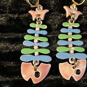 Vintage Dangling Articulated Enamel On Metal Fish Clip On Earrings Pink Teal