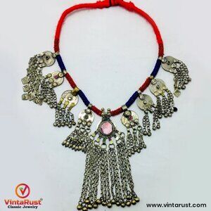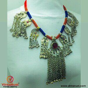 • This vintage-inspired tribal necklace has an intricately carved design on the pendant. This necklace is very lightweight and easy to wear. This necklace is a simple add-on to your outfit. The vibrant dangling tassels generate a quite melodious voice with every step.