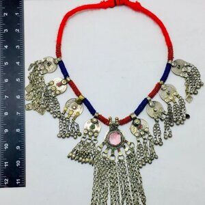 Beautiful tiny multiple coin pendants pop on the sides of this beaded necklace with their beautiful tiny bright stones. Each pendant is inlaid with an enamel stone. Delicate beadwork of blue and red color is wrapped around the cotton cord on this necklace.