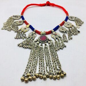 Vintage Dangling Coins and Long Silver Bells Necklace,Blue and Red Beaded
