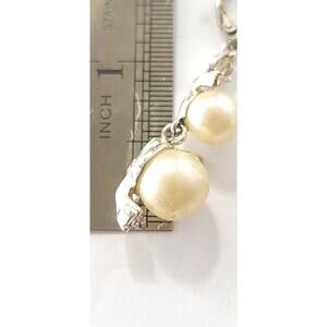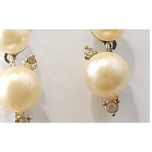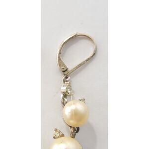 These vintage earrings feature a pair of dangling faux pearls, each adorned with small rhinestones. The pearls are of a creamy white color, adding a touch of elegance and classic charm to the design. They are set in a silver-tone metal, which complements the pearls beautifully. The lever-back clasps ensure secure and comfortable wear, making them suitable for various occasions, from casual outings to formal events. The addition of rhinestones adds a subtle sparkle, enhancing their overall appeal. These earrings are a lovely example of vintage costume jewelry, combining timeless materials and design elements.