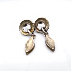 These vintage silver earrings feature a unique dangling leaf design. Their antique look adds a touch of elegance to any outfit.