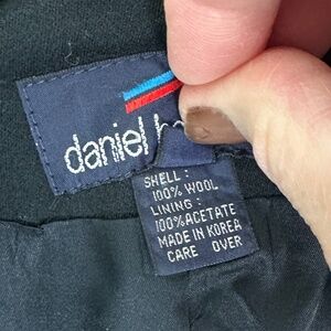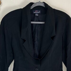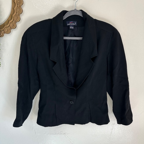 Vintage 80s Daniel Hechter black blazer in 100% wool featuring exaggerated shoulders and a cinched in waistline. So flattering and cute and can be paired with so many looks. Belted feature at the back waist. Single front button closure. Lined.