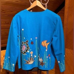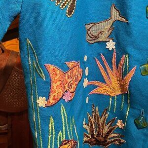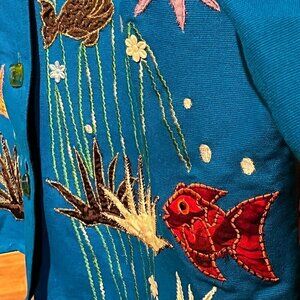 Vintage Daniel K Wearable Art Teal Blue Under the Sea Life Blazer Jacket - Depicting Sea life - fish, starfish, sea turtles, flowers, and seaweed which are beautifully embroidered with metallic threading. The lucite square buttons are clear and green which appear to be sea water. It is truly Wearable Art! This jacket is perfect dressed up or down. Would be a great addition to your cruise attire!!