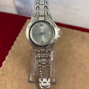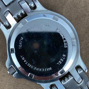 Designer Vintage Daniel Mink Swiss Made solid Stainless Steel Watch. Elegant Style with Silver Enamel Face and Date at 3 O'clock, Roman Numerals, with Silver Hands, Sapphire Crystal Swiss 7 Jewel V8 ETA Movement. New battery cleaned. Water resistant to 10 ATM (360 feet) Its ready to wear 7.375 inch Stainless Steel Case is is 1 inch Diameter. Back is stainless steel, High Quality Luxury Watch from the 90's Danial Mink Md# 31117