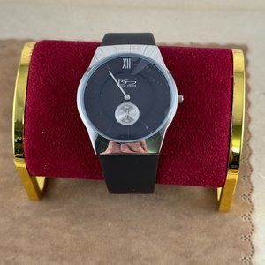 Vintage Daniel Steiger Steel on Black On Stainless Steel. There is Silver Markers and Sub Dial Second hand at 6 Recessed Markers. Excellent New Demo condition new battery cleaned and ready to wear. Black Leather 9 inch Strap Case is 1.5 inches in Diameter. This is a High Quality Watch line started in the Mid 1990's this watch is from the early 1999-2003 most early models have the name on the face. Marked on the Back is 91968s-M Model Japan Movement, Water Resistant ro 3 ATM all Stainless Steel