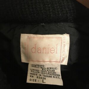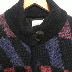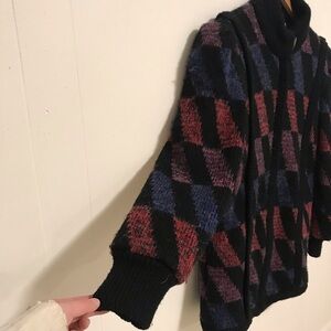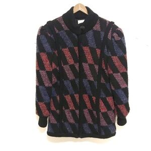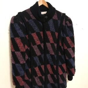 In good used vintage condition. Very unique! Fuzzy and wool like. Zip front. Black blue and red. Long. There is quite a bit of piling due to the content of the fabric. Very cool and trendy.