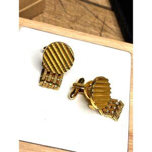 These cufflinks showcase a sophisticated gold-tone finish and a textured round design, perfect for elevating formal attire. Ideal for collectors or fashion enthusiasts, they add a touch of vintage elegance to any ensemble. These are presented in their original box, adding to their charm and value.