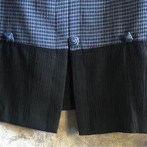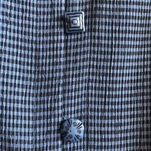 Blue & black plaid patterned top with a black silky style color block bottom. This versatile blouse will look great for any formal or business event or even dinner out. Pair it with black skirt or slacks for a classic look! Take a look at each button with a different design!