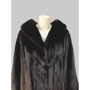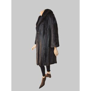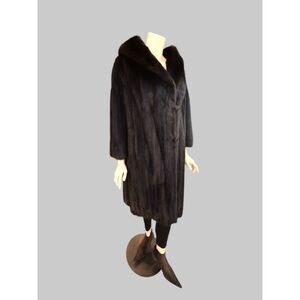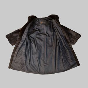 This wonderful coat is made with soft lunaraine mink fur. Comfortable medium. It features a classic design, a shawl collar, and a lining with flowers stitched on the inside corners. This vintage fur coat is in excellent condition and has been stored under ideal conditions in our cold fur storage vault. There are 3 beautiful button closures and 2 pockets plus one hidden inside pocket. The silk-blend lining is in excellent condition with no signs of wear. There is a small monogram on the inside lining.