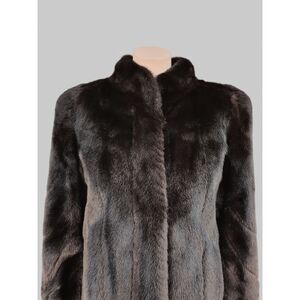 This is a lovely dark brown mink jacket with soft fur and an elegant look. Comfortable medium/large. It features a classic design with deep brown mink fur, and a mandarin collar. This vintage fur jacket is in excellent condition and has been stored under ideal conditions in our cold fur storage vault. There are 3 hook & eye closures and 2 pockets, plus 1 hidden inside pocket. The silk-blend lining features a beautiful intricate embroidered design and the fabric is in excellent condition with no tears or stains. There is no monogram inside!
