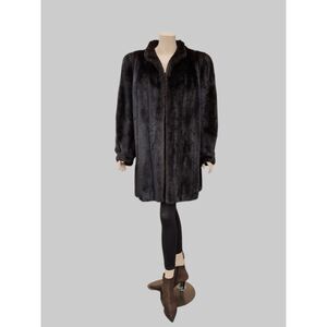 This jacket is truly a piece of art. Comfortable extra large. It features a classic design with dark brown mink fur, and a winged collar. This vintage fur jacket is in pristine condition and has been stored under ideal conditions in our cold fur storage vault. There are 2 hook & eye closures and 2 pockets. The silk-blend lining is in perfect condition. There is a small monogram on the inside lining.