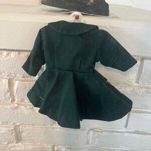 Beautiful vintage doll coat with matching crocheted hat and mini metal wire doll hanger (not pictured). The coat is a lovely shade of dark emerald green with white buttons, and sits beautifully as if tailored by a dressmaker. The hat is white crochet with pink and purple rosettes and green leaves circling the brim. Coat measures 8.5” long and hat measures 4" across. All doll clothes are sold as-is in vintage condition with discolorations and/or other imperfections as pictured.