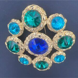 This vibrant vintage brooch features a striking mix of blue and green rhinestones in a textured gold-tone setting, ideal for enhancing formal attire.