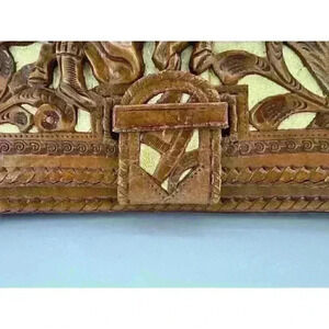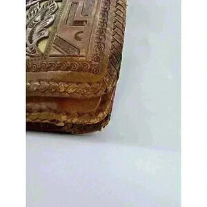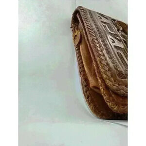 The Vintage Davalos Mexico Hand Tooled Leather Handbag is a medium-sized shoulder bag made of brown leather with cut-out accents. It features a slide closure, brown leather handle/strap, and hand-carved matador and bull design. The bag has inner pockets and dividers, and is lined with brown leather. The strap drop is 8 inches. This handmade bag is perfect for women who love western, designer, Aztec, cowboy, cowgirl, and vintage themes. It comes with a lock accessory and is made in Mexico.