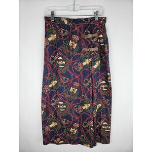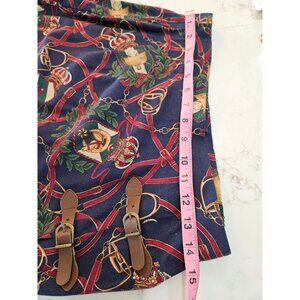 This vintage David Brooks wrap skirt features a unique equestrian pattern with leather buckle accents, offering a professional yet distinctive style. It's crafted from a cotton-rayon blend for a comfortable fit and feel.