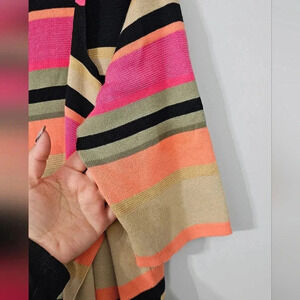 Vibrant striped cardigan by David Brooks. Features pink, black, orange, green, and cream stripes. Short sleeves. Open front design.
