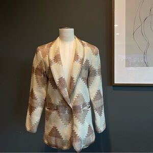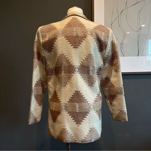 Elevate your style with this chic geometric patterned jacket. Featuring a blend of cream and brown tones, this piece is perfect for any occasion. Its unique design adds a touch of sophistication to your wardrobe. Excellent condition. This blazer is art.