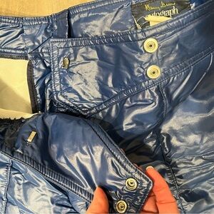 Vintage and likely from the 1960’s or 70’s. Lightweight with nylon outer and light polyester lining Metal zipper pulls and snaps with a flap over the zipper All zippers are in good shape. Interior elastic gator to keep snow out of pant leg.