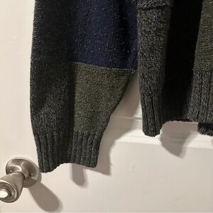 Vintage 90s check patterned knit sweater in shades of navy blue, gray, and olive green. Crew neck, relaxed fit, ribbed cuffs, neckline & hem.
