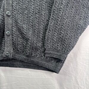 This Vintage David Taylor Sweater is a men's large, chunky-knit cardigan in a solid gray color. It features a V-neckline, long sleeves, and button accents. Made of acrylic material, this 90s-themed sweater is perfect for casual occasions in the winter and fall seasons. With a regular fit and all seasons features, this button-up cardigan is a stylish and versatile addition to any man's wardrobe. Made in the United States, this vintage sweater from David Taylor offers a classic and comfortable look.