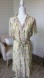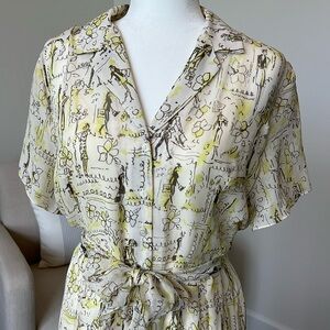 Full button down front with silk fabric waist tie belt Bottom of the skirt has little pleats in the front.