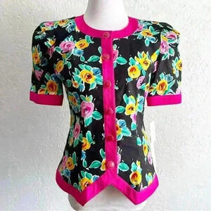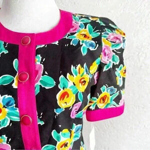 Vintage David Warren deadstock floral puff sleeve button front top size 6. Absolutely stunning!! A great piece to make a statement with. Short puff sleeves with shoulder pads, black base with bright floral pops. Bright pink trim and buttons. 100% cotton, lightweight. Wear as a top or can be worn open. Vintage (small) sizing so please use pictured measurements.